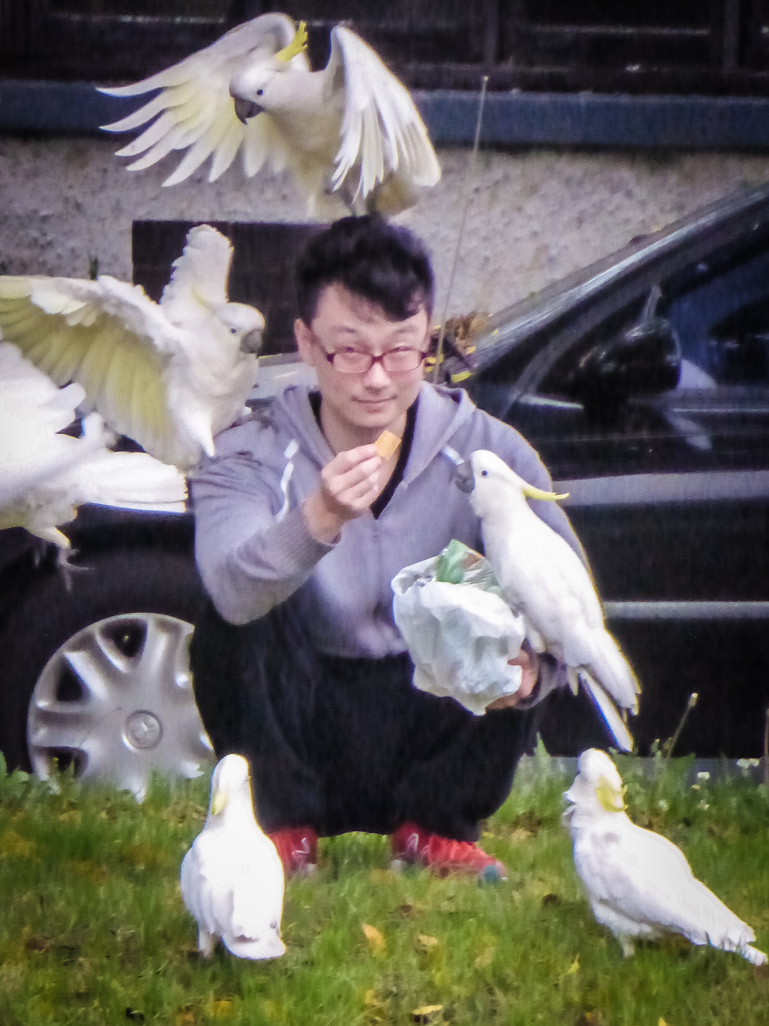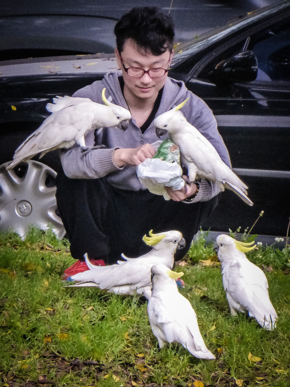?The cockatoos seem to only land on the heads of people that are feeding them…. which is why I haven’t fed any yet. I saw another woman trying to feed them in the park and they swooped down on her like something out of a Hitchcock movie (and she did squeal). The fellow pictured here seemed to have a better handle on feeding them as they were much more gentle with him.